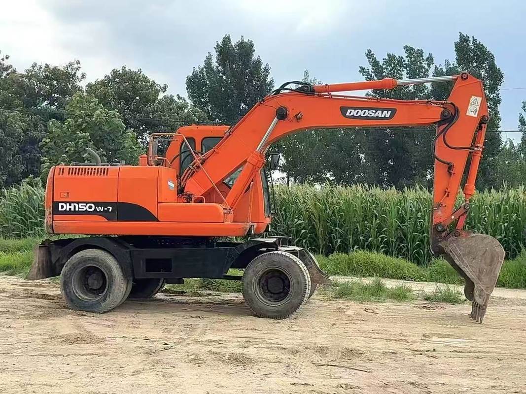 Excavadora usada Doosan DH150W-7 con ruedas, 15 toneladas de peso de operación, buen estado, horas de trabajo bajas, lista para exportación desde China, ideal para construcción de carreteras, proyectos urbanos,y operaciones mineras ligeras.